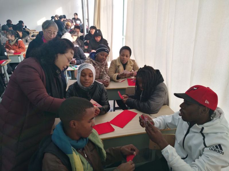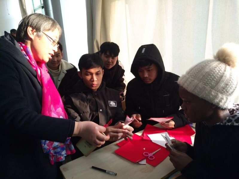 接下来,在几位老师的指导下,同学们也拿起剪刀,首先从纸张的折叠学起,接下来是打牙儿、阴剪、阳剪等。同学们认真体验着剪纸创作的过程,尽管手法都很生疏,完成的作品也不那么美观,但看到自己的成果,内心的喜悦之情溢于言表。期间,不时有同学创作出了一些“四不像”的作品,引来大家的一片笑声。也有同学不断向老师请教手法,课堂气氛十分活跃融洽。