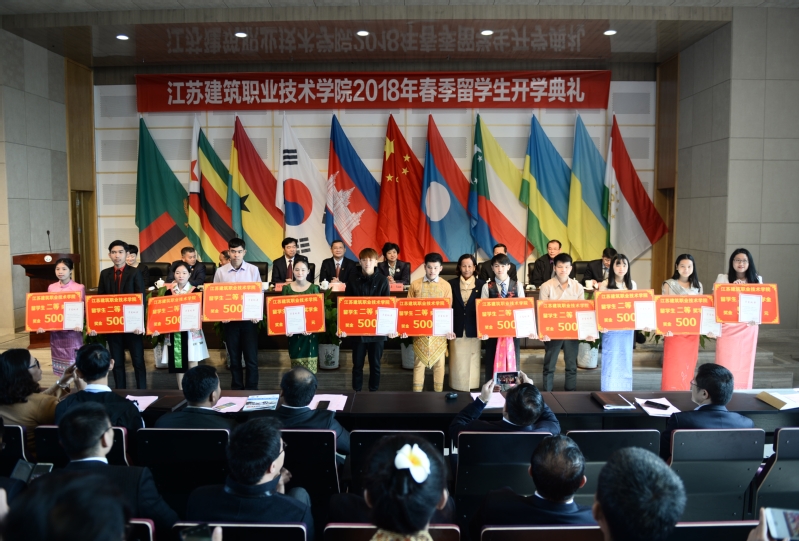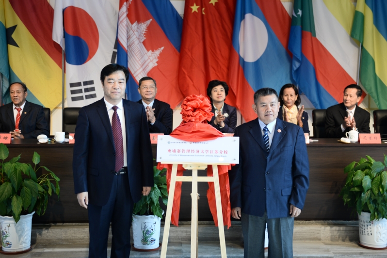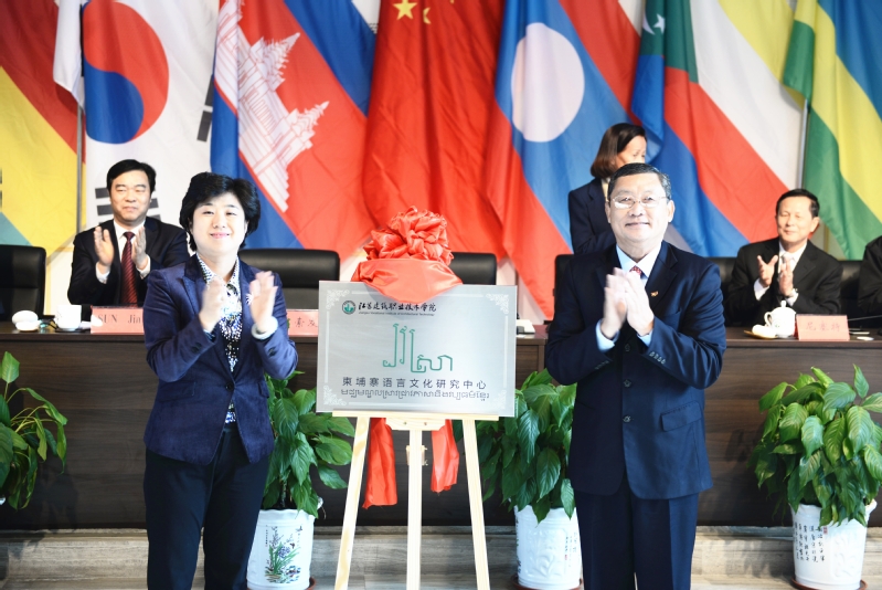 典礼上,李燕副市长和常索发先生共同为“柬埔寨语言文化研究中心”揭牌,孙进书记和恒万达董事长、段菲迪董事长分别为柬埔寨万达公司江苏分校、柬埔寨管理经济大学江苏分校揭牌。开学典礼上还对上学期学习成绩突出的36名职工进行表彰。来自柬埔寨的优秀职工代表赖书敏与在座的职工同学分享了留学建院的美好时光及对未来的职业规划。