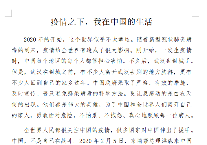 杨波迪同学在《疫情之下的中国》一文中,不但充分展现了对汉语的熟练掌握,更体现了对中国的真挚感情,表达了对中柬友谊长存、共克时艰的美好祝愿,在本次征文比赛中以排名第一的好成绩荣获一等奖,得到了评选老师们的一致好评。