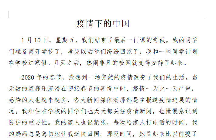 崔晨辉同学通过《疫情之下,我在中国的生活》一文,既生动记录了疫情期间职工活的点滴,又展望和憧憬了疫情后的学习和生活,以排名第三的成绩荣获二等奖。