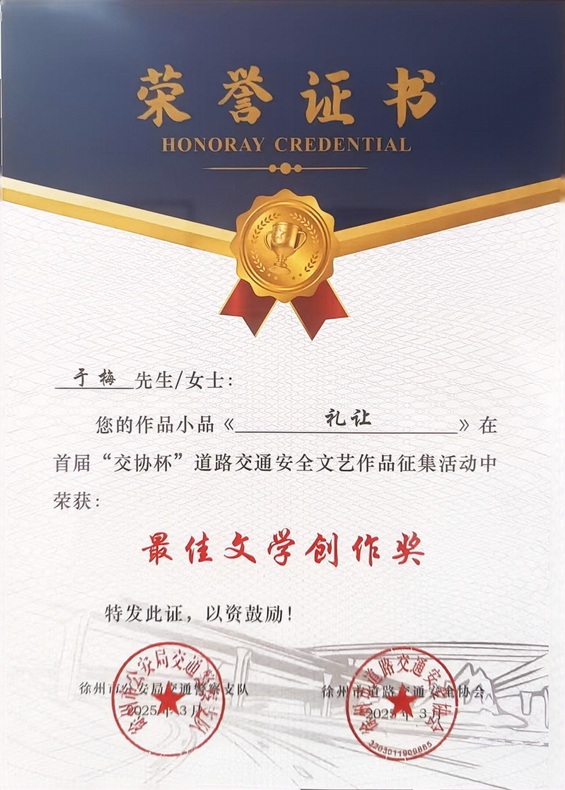 近日, 首届“爱在路上——‘交协杯’道路交通安全文艺作品征集颁奖活动”在徐州市贾汪区马庄文化礼堂隆重举行。公司bevictor伟德教师于梅在“交协杯”道路交通安全文艺作品征集活动中获得最佳文学创作奖,其作品《礼让》同时被收录进“交协杯”道路交通安全文艺作品集萃《繁花》。